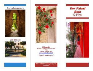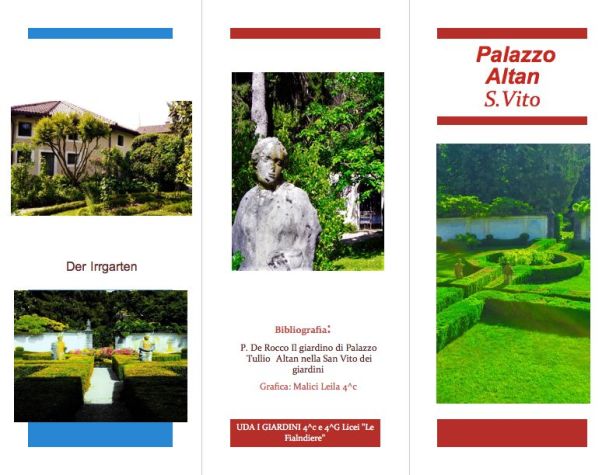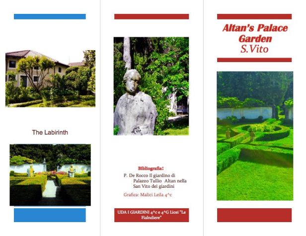 L’UDA svolta nelle classi IV C e IVG dell’a.s. 2015-16 ha avuto per tema “Il Giardino”. Dopo un percorso sulla storia del giardino nei suoi vari aspetti (artistici, storici, filosofici, religiosi) sono stati analizzati due giardini di San Vito, il Parco di Palazzo Rota e il Parco di Palazzo Altan. Gli allievi hanno quindi prodotto schede riassuntive in lingua inglese, spagnola e tedesca e realizzato i relativi pieghevoli.