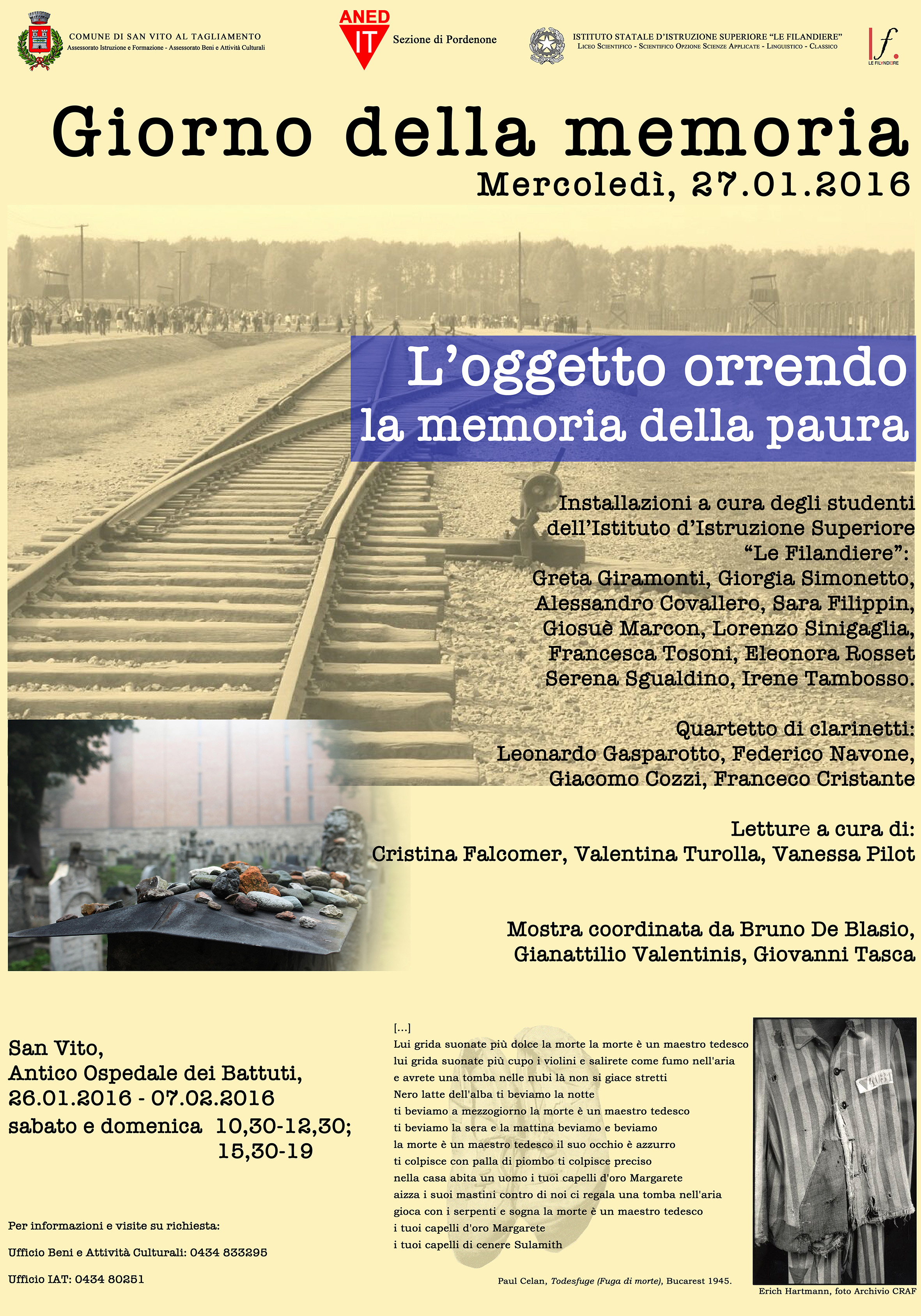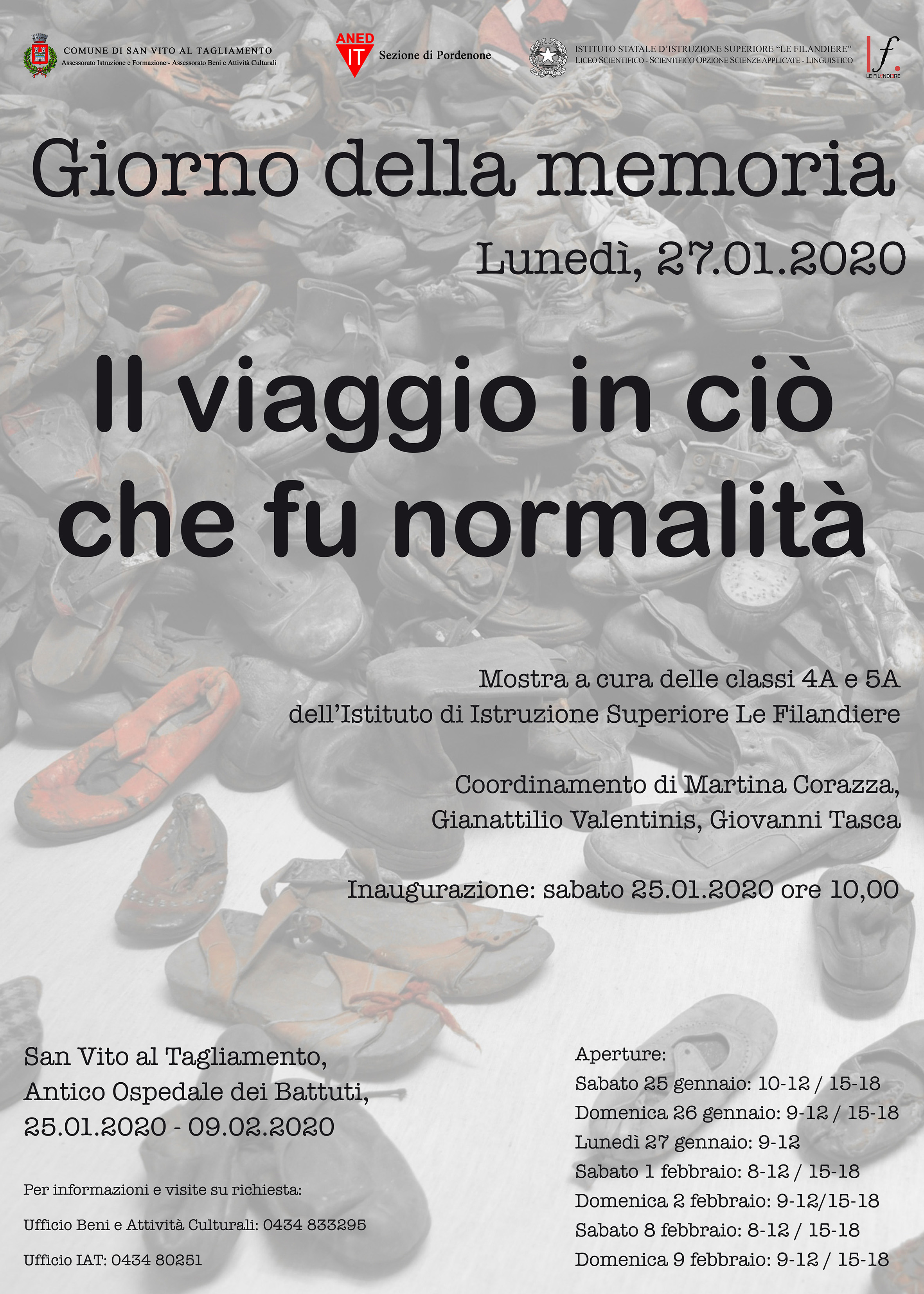 Dal 2014 le classi del Liceo impegnate nel Progetto Olocausto hanno contribuito alle iniziative per il Giorno della Memoria di San Vito proponendo alla cittadinanza in una mostra i risultati del loro lavoro e le loro riflessioni. Quest’anno le attività del Progetto non si sono potute svolgere. Ma rimane l’imperativo: non dimenticare che questo è stato.